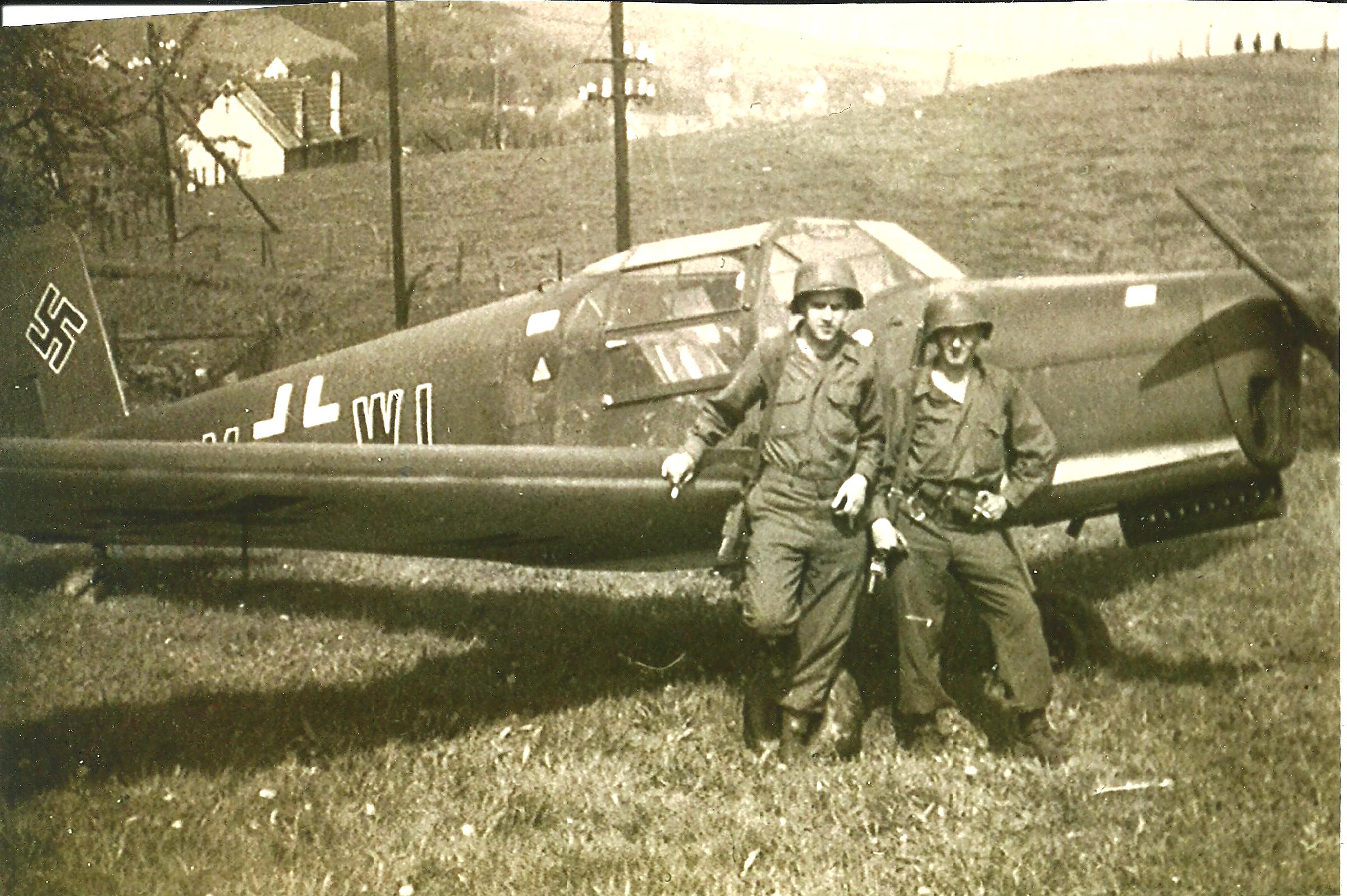 Ausgerollt entstieg ich der Bücker, nahm meinen Brustbeutel an mich, in dem ich Speck und Butter gehamstert hatte und ging auf die mir aus meiner Kindheit bekannte Landewiese. Gleich darauf peitschten zwei Schüsse durch die Morgenstille, dann noch zwei und Erde spritzte vor mir hoch. Ich ging auf die beiden amerikanischen GI's, die mir entgegenkamen, zu. Die erste Frage “From where do you come?“ War schnell beantwortet: "From northern Germany". "What kind of plane is it you came with, a bomber-plane?" "No a little Trainer-Plane." Es ging zwischen uns hin und her. Ob ich Waffen an Bord hätte, neeee, keine. Sie seien beide Cowboys from Texas und ich erfuhr, dass die ganze US-Army aus solchen Cowboys bestand, der Job hatte seit Karl May auch in Deutschland ein hohes Rennomee.